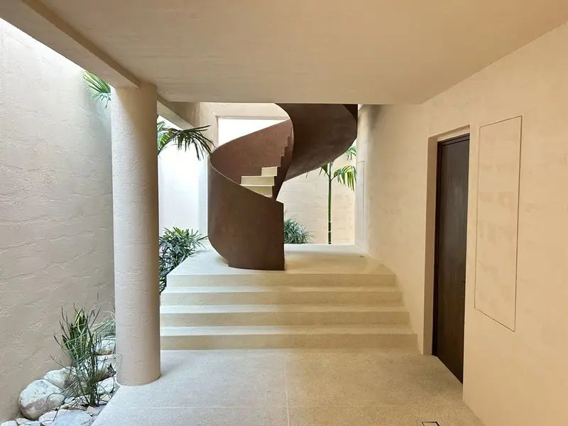 The other side of the building is just as impressive, with a striking staircase. The Master suite serene space is filled with light, offering garden access through large windows. Upstairs, you’ll find four more bedrooms and two multifunctional rooms — perfect for a yoga space, walk-in closet, or anything that brings comfort and style.