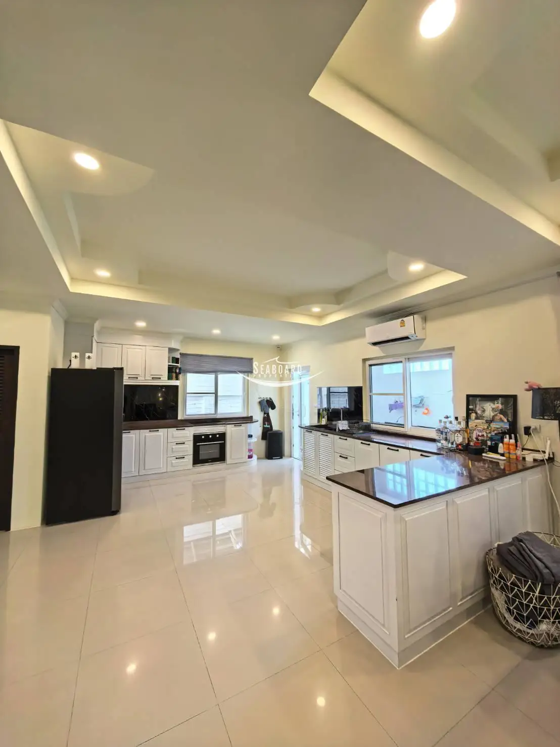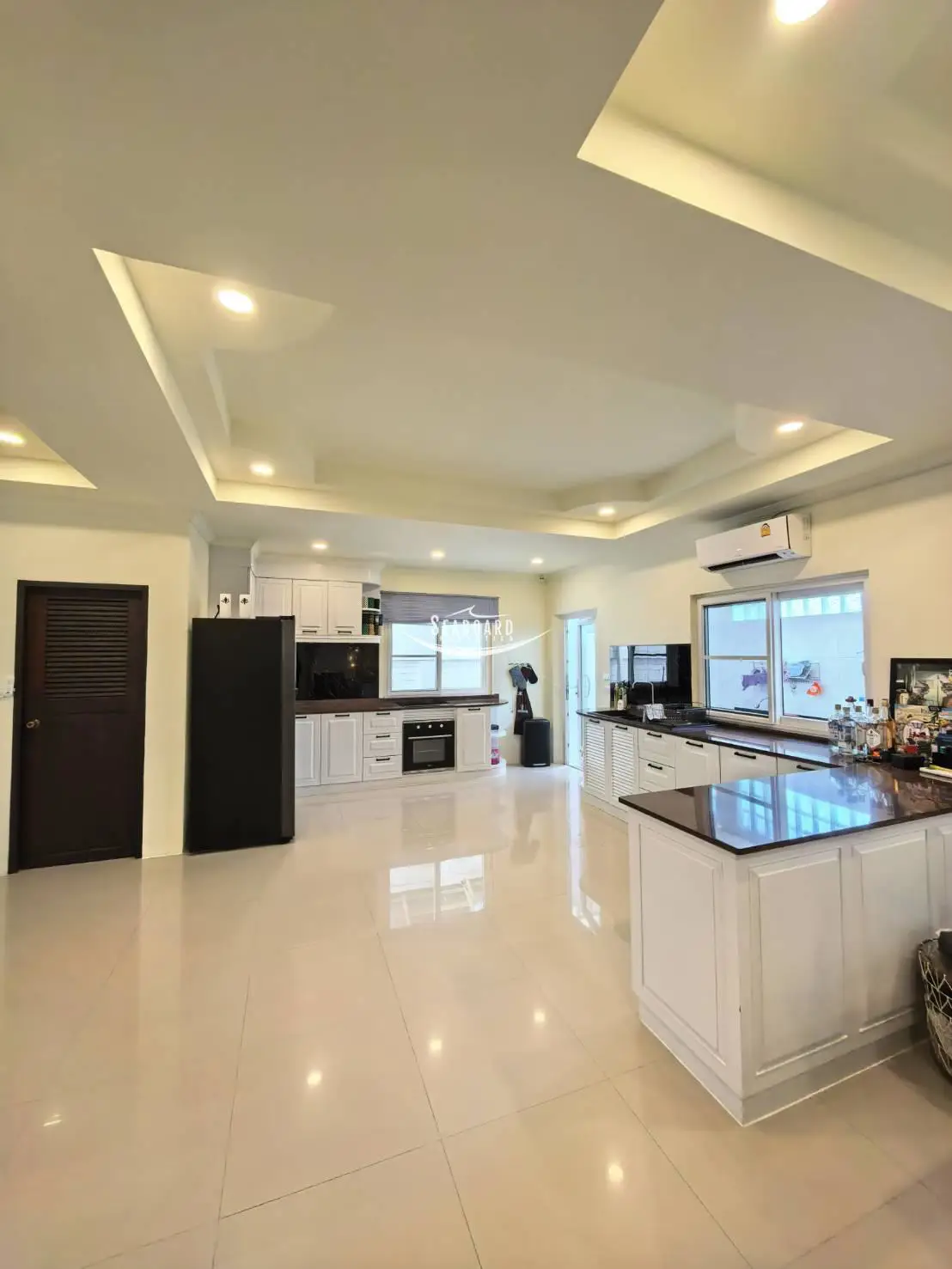 การออกแบบ: ห้องโถงเพดานสูง โปร่งโล่ง สบายตา พื้นที่ครัวและโซนรับแขกเชื่อมต่อกันอย่างลงตัว
