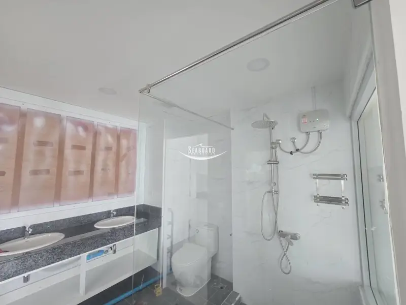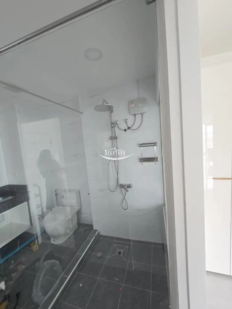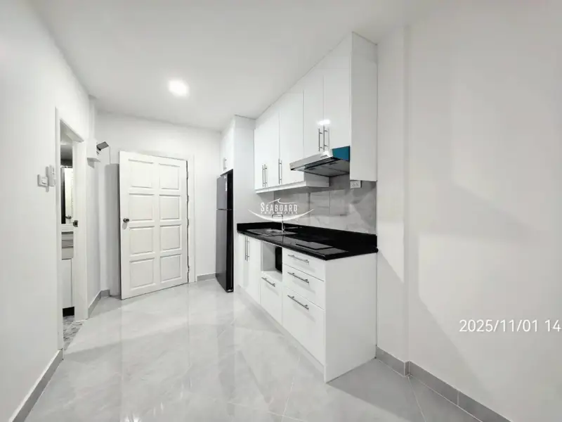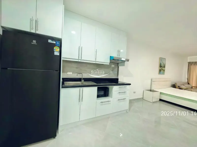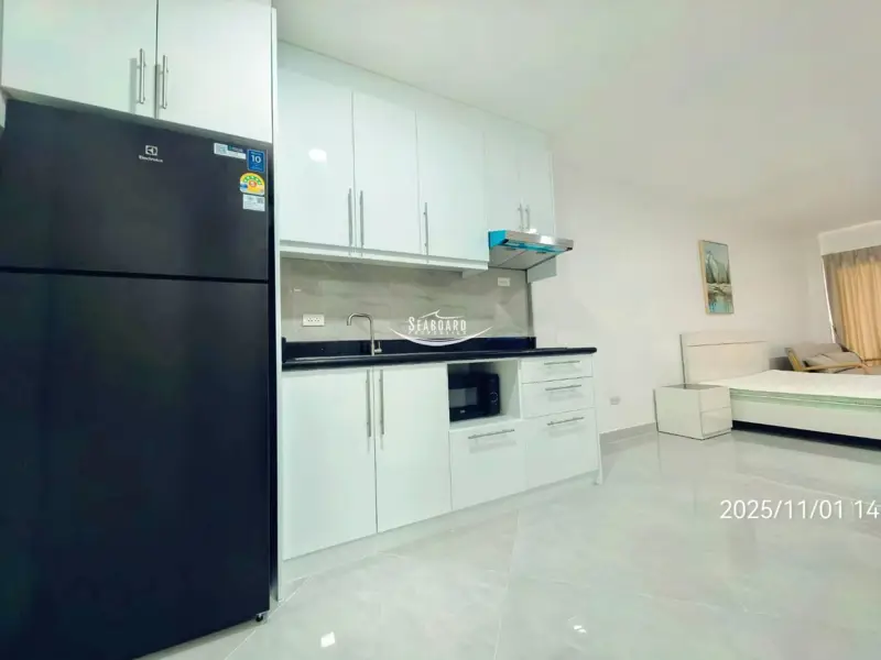 This Apartment Complex offers direct access to Pattaya Beach Road and Second Road, a swimming pool, Security with CCTV, and secure parking inside the building. It is a modern, Western-style apartment with a balcony, fully furnished kitchen, air conditioning, and modern bathroom.